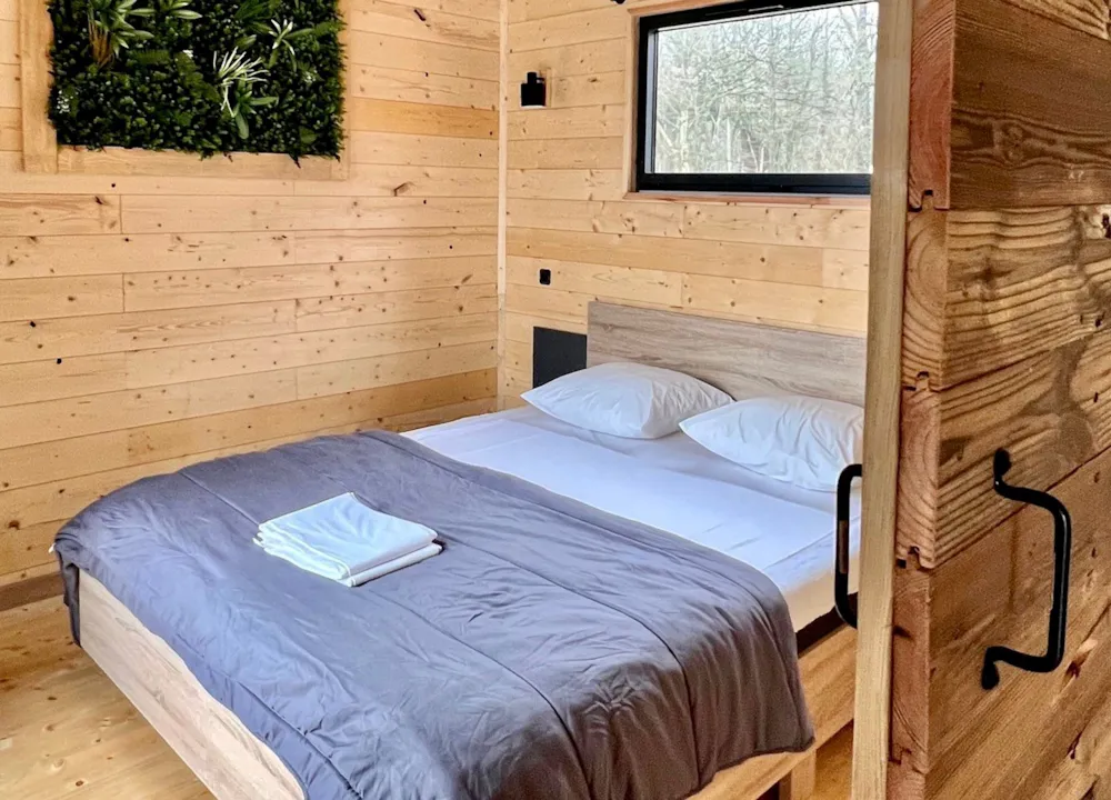Plutôt adaptée à des familles, ou groupe d’amis avec max 5 adultes selon les couchages. Elle dispose d’une chambre double confortable avec vue imprenable sur l’étang, idéale pour des moments de détente. Une mezzanine accessible par échelle offre un espace de couchage avec deux lits superposés et deux lits simples, plutôt adaptée à des enfants. La pièce à vivre, lumineuse, bénéficie également d’une vue panoramique sur l’étang avec comme confort une climatisation réversible.