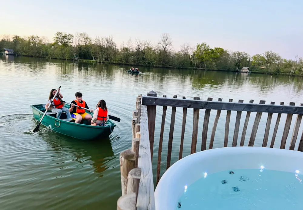 Accessible par un ponton, vous pourrez profiter d’une barque (sans dame de nage) à votre disposition pour vous balader sur l’étang. Vous apprécierez le jacuzzi privatif pour des instants de relaxation. La cabane dispose d’une salle d’eau avec douche et toilettes, pas de cuisine mais un petit frigo à disposition. Un cadre idyllique pour une expérience unique en famille ou entre amis.