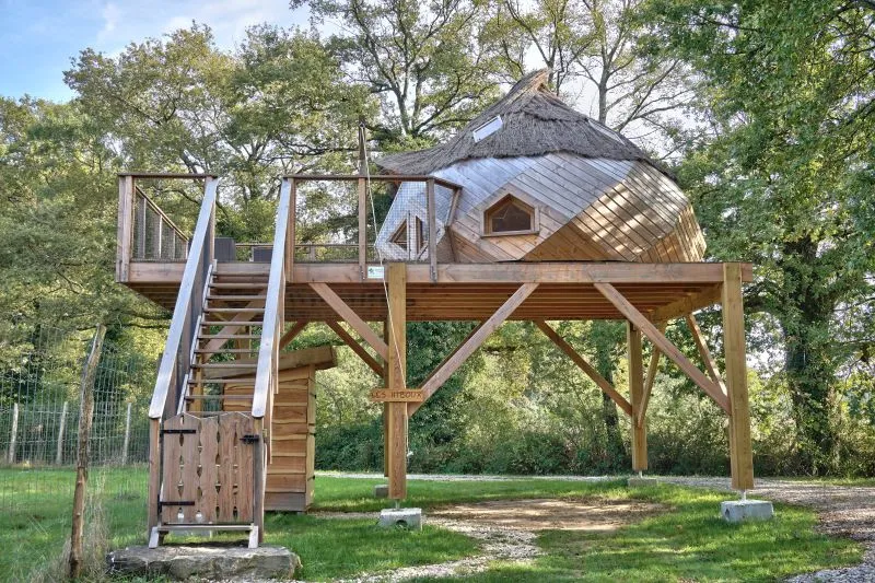 Avec sa forme unique en zome, cette cabane perchée vous invite à vivre une expérience inoubliable, le tout au coeur du parc des cerfs et des daims. On apprécie la situation privilégiée de cette cabane sans vis à vis, au bout du bout du Domaine pour une tranquilité absolue. Celle des vacanciers mais aussi celles des animaux qui aiment se reposer dans les hautes herbes de la prairie juste au pied des pilotis.