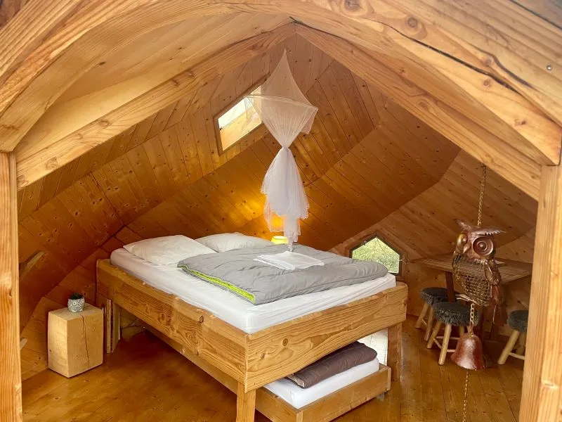 Le Cocon perché des hiboux pour 2 à 3 personnes, est un lodge Confort équipé d’électricité et de toilettes sèches (sous la cabane). Comptez 5min à pied pour se rendre aux salles de bain individuelles de la zone animalière.