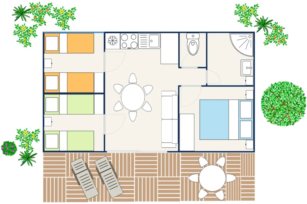 L'ÉLITE (6 pers. maximum) offre : Surface totale de 60.34 m2 Grande terrasse entièrement couverte de 22 m2 Décoration soignée et design contemporain 3 chambres spacieuses : - 1 lit double (140 x 200 cm) - 4 lits simples (80 x 200 cm) Un séjour coin repas avec TV écran plat Une cuisine équipée: grand frigo-congélateur, grand lave-vaisselle, micro-ondes 1 salle de bains (douche, lavabo) 1 WC séparé Climatisation Chauffage Buanderie Zone piétonne et parking privatif