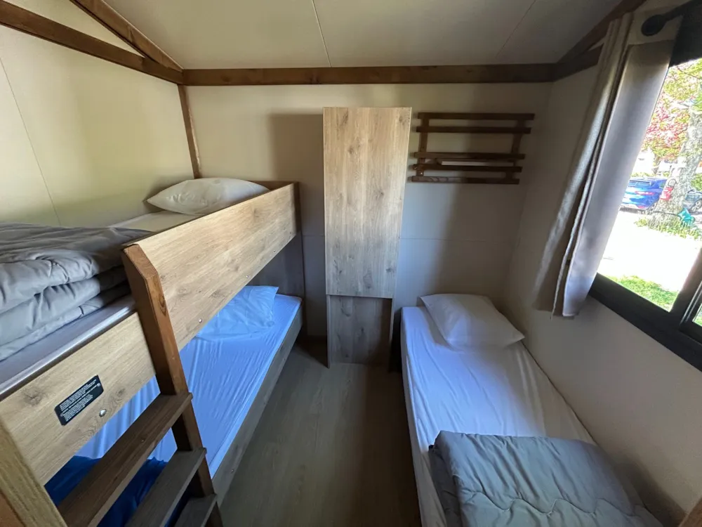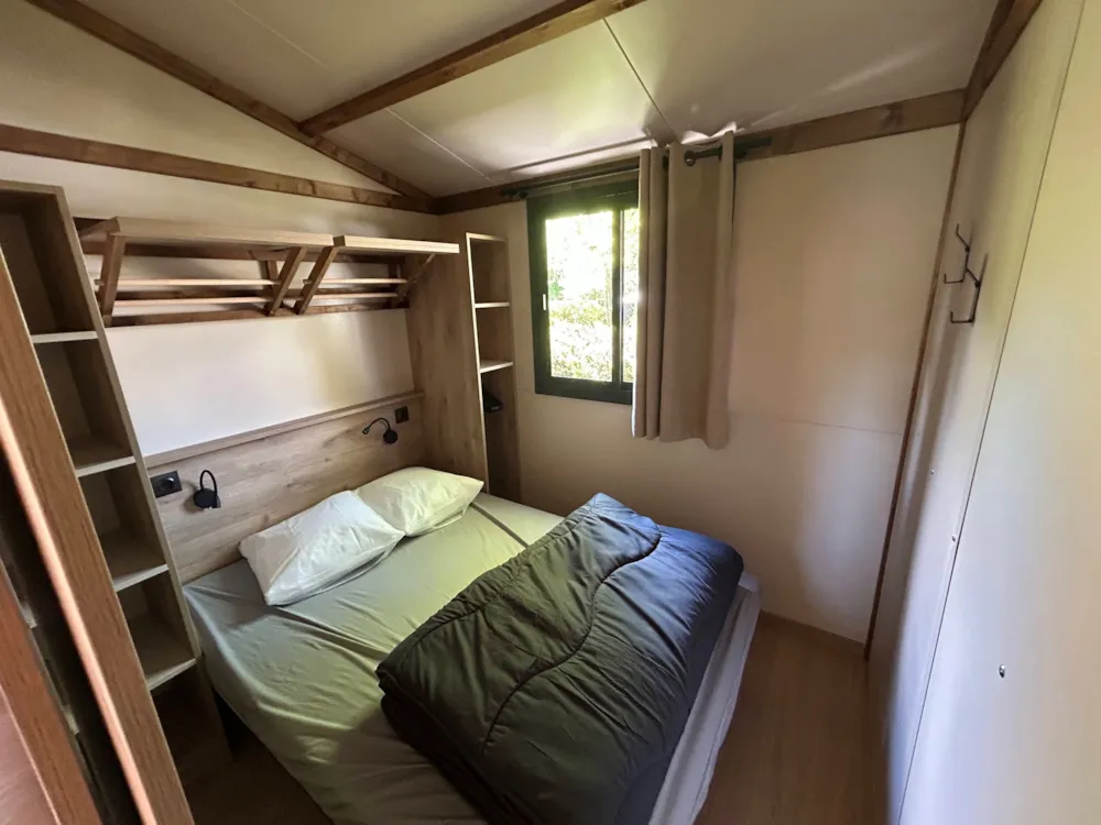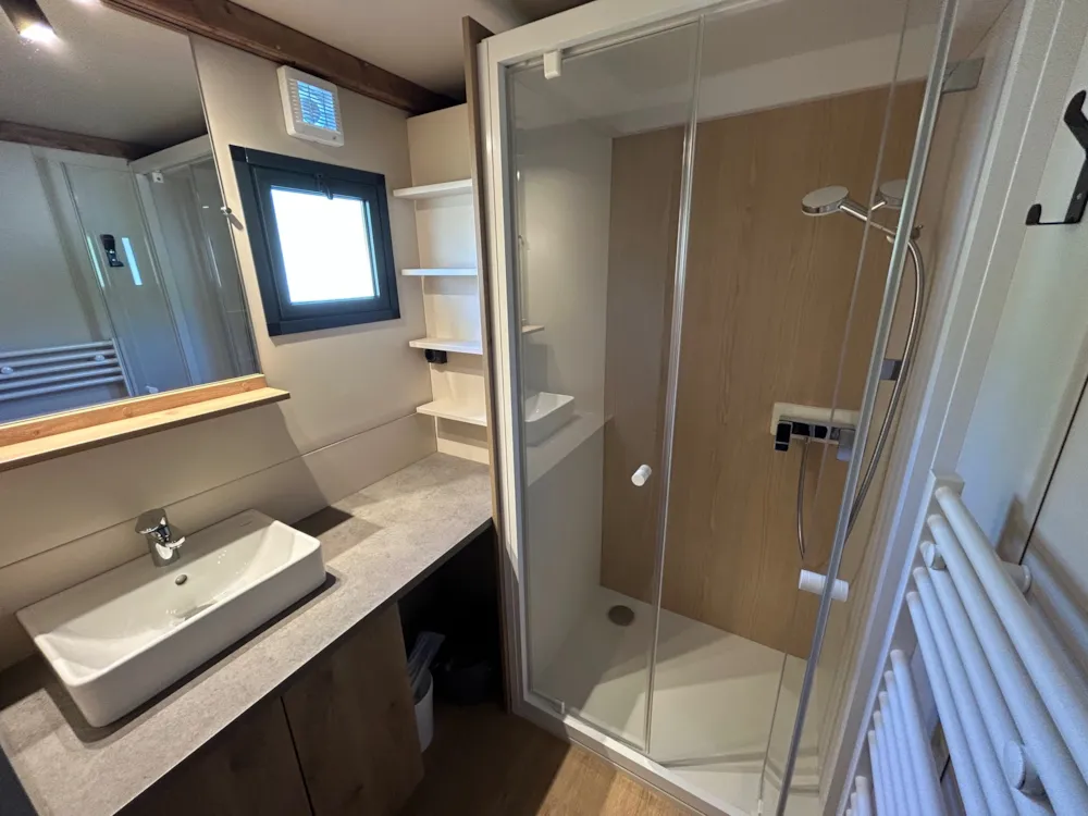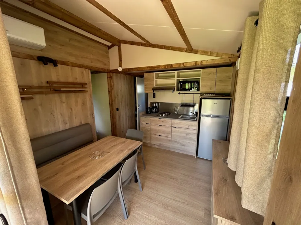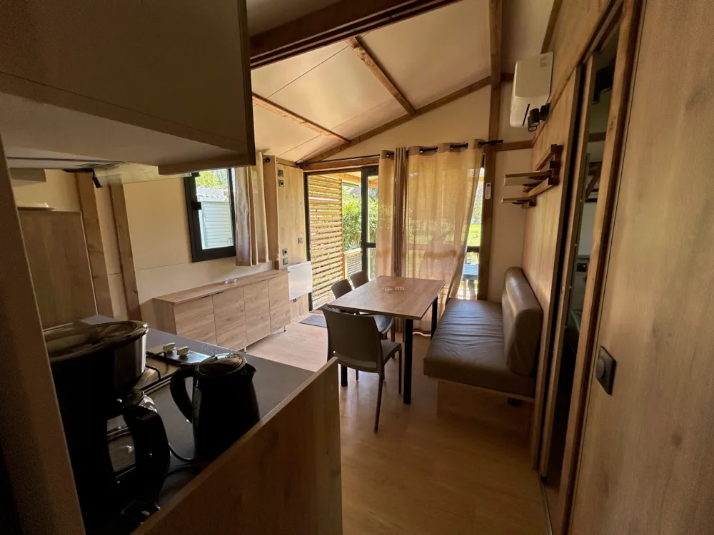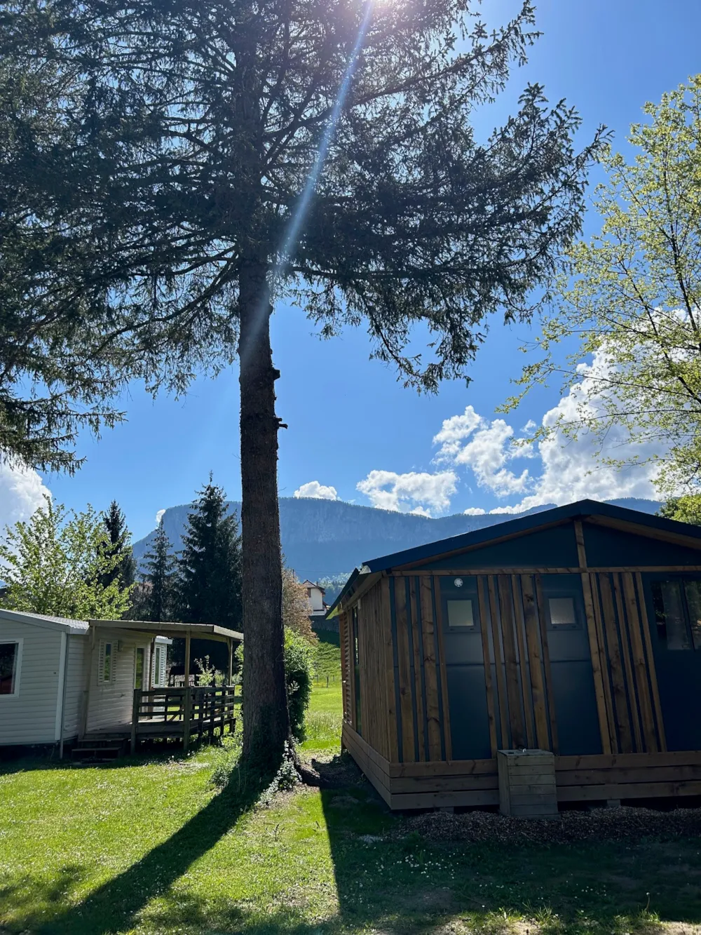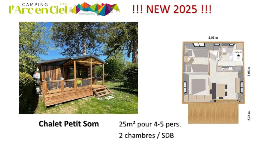 Nouveauté 2025 ! Chalet de 2 chambres climatisé, idéal pour une famille de 4-5 pers, avec salle de bain et WC séparés. Vous bénéficiez d’un séjour avec cuisine et d'une belle terrasse extérieure abritée avec vue sur montagnes.