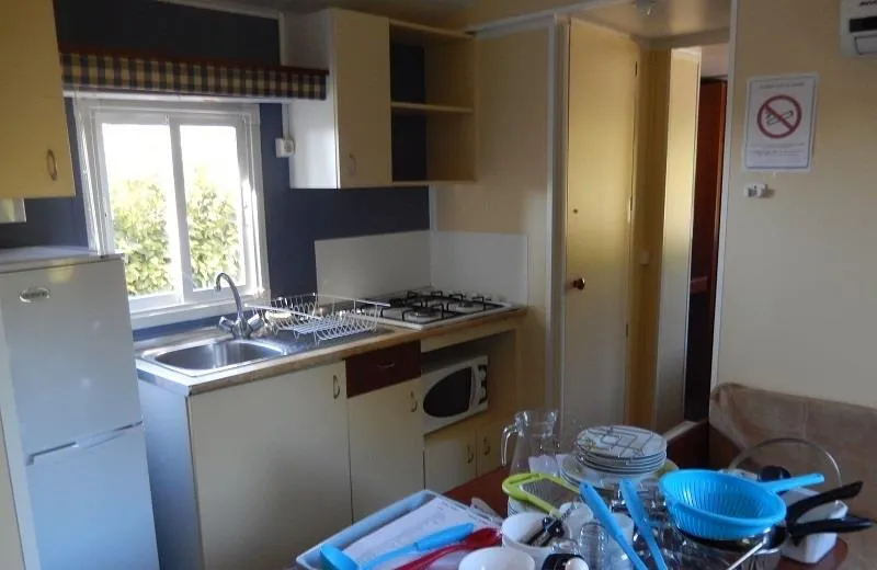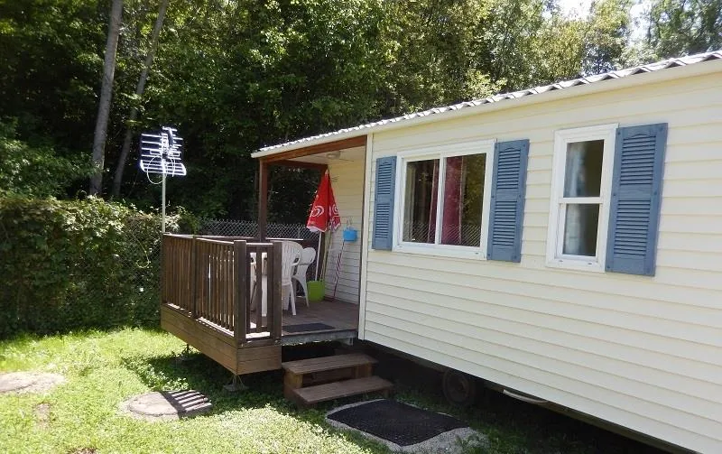 Mobil-home de 8m par 3m avec terrasse en bois sur emplacement spacieux et délimité. Vous y trouverez, 1 chambre double avec rangements, 1 chambre avec 2 lits simples et rangements, 1 salle d'eau avec douche et rangements, 1 WC séparé, 1 Cuisine équipée avec tous le nécessaire pour cuisiner, 1 coin salon/salle à manger avec table et banquette. En extérieur vous trouverez un salon de jardin pour prendre vos apéros ou manger en plein air.