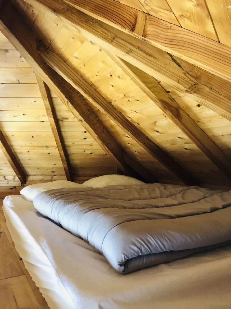 Cette cabane en gamme confort (avec électricité sans eau et toilettes sèches) est idéale pour accueillir une famille de 4 personnes car elle est équipée de 2 lits doubles dont 1 en mezzanine accessible par une échelle en bois.